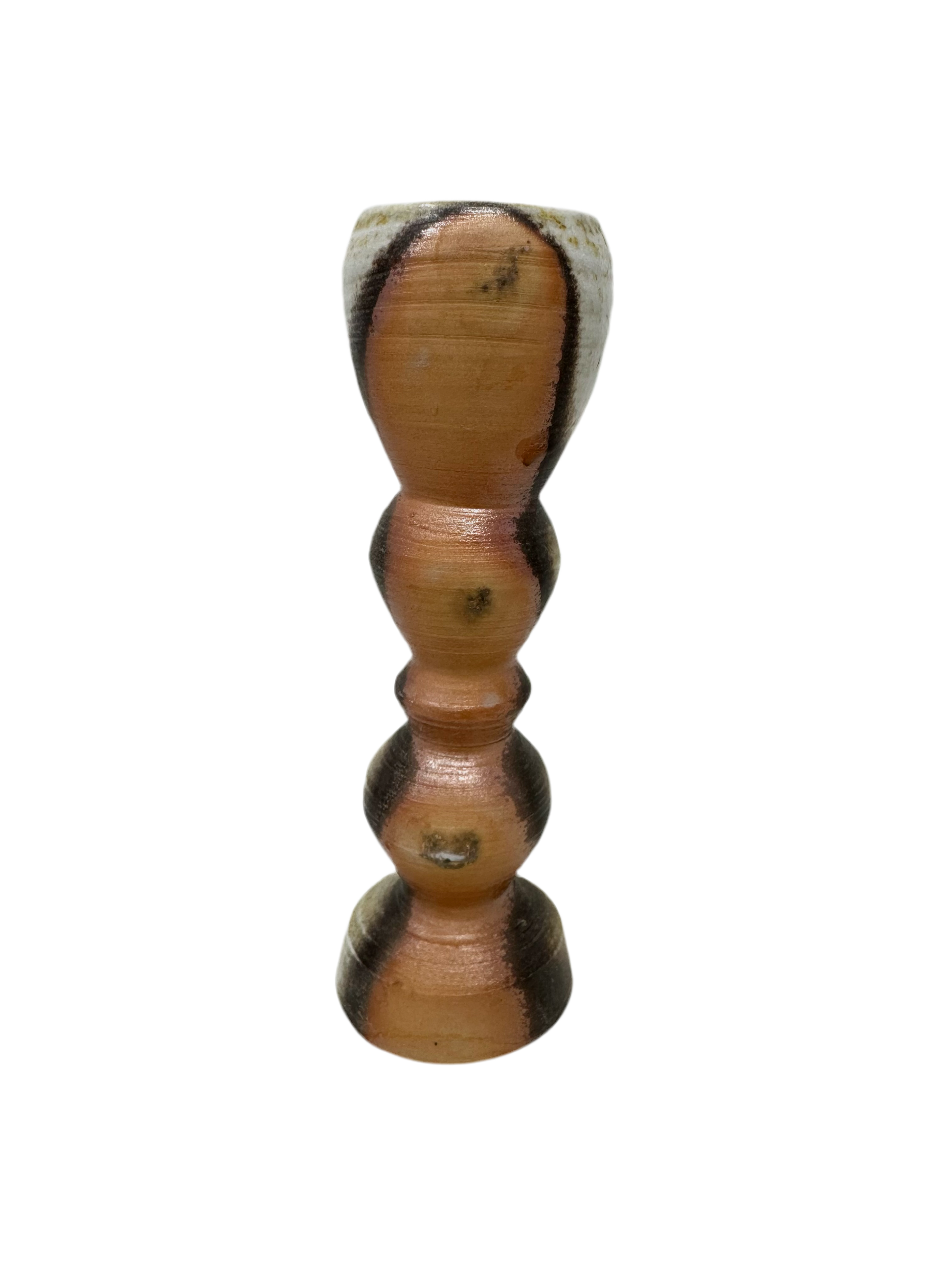 This porcelain candle stick holder will fit your standard size taper candle. It has some lovely dramatic flashing marks and hues ranging from orange to white with golden crystals of melted wood ash and smoky charcoal grays.